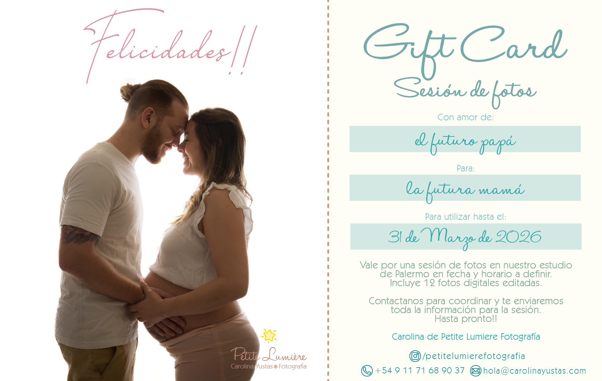Podés regalarle la sesión a la futura mamá y al futuro papá. Para las sesiones que se regalan, les diseñamos una Gift card digital personalizada con los nombres de quienes regalan y quienes reciben, para que se la entreguen a la familia del niño y les den la sorpresa. Los papás nos contactan por cualquiera de los medios que figuran en la Gift Card y coordinamos una fecha para la sesión.